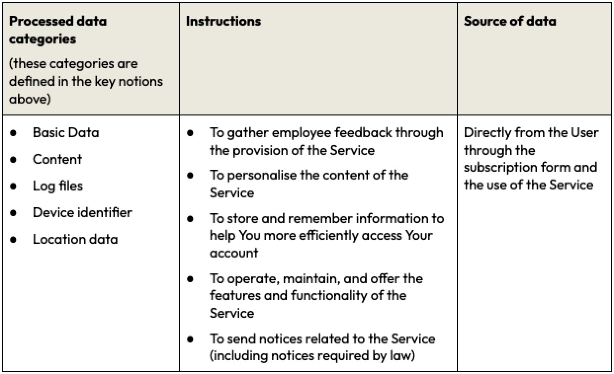 Through the Service, Butterfly processes Your Personal Data on behalf of Your Employer. This is in order for the latter to provide the Service within its organisation and to provide You access to the Service, and to ultimately achieve Your Employer’s processing purposes described above.