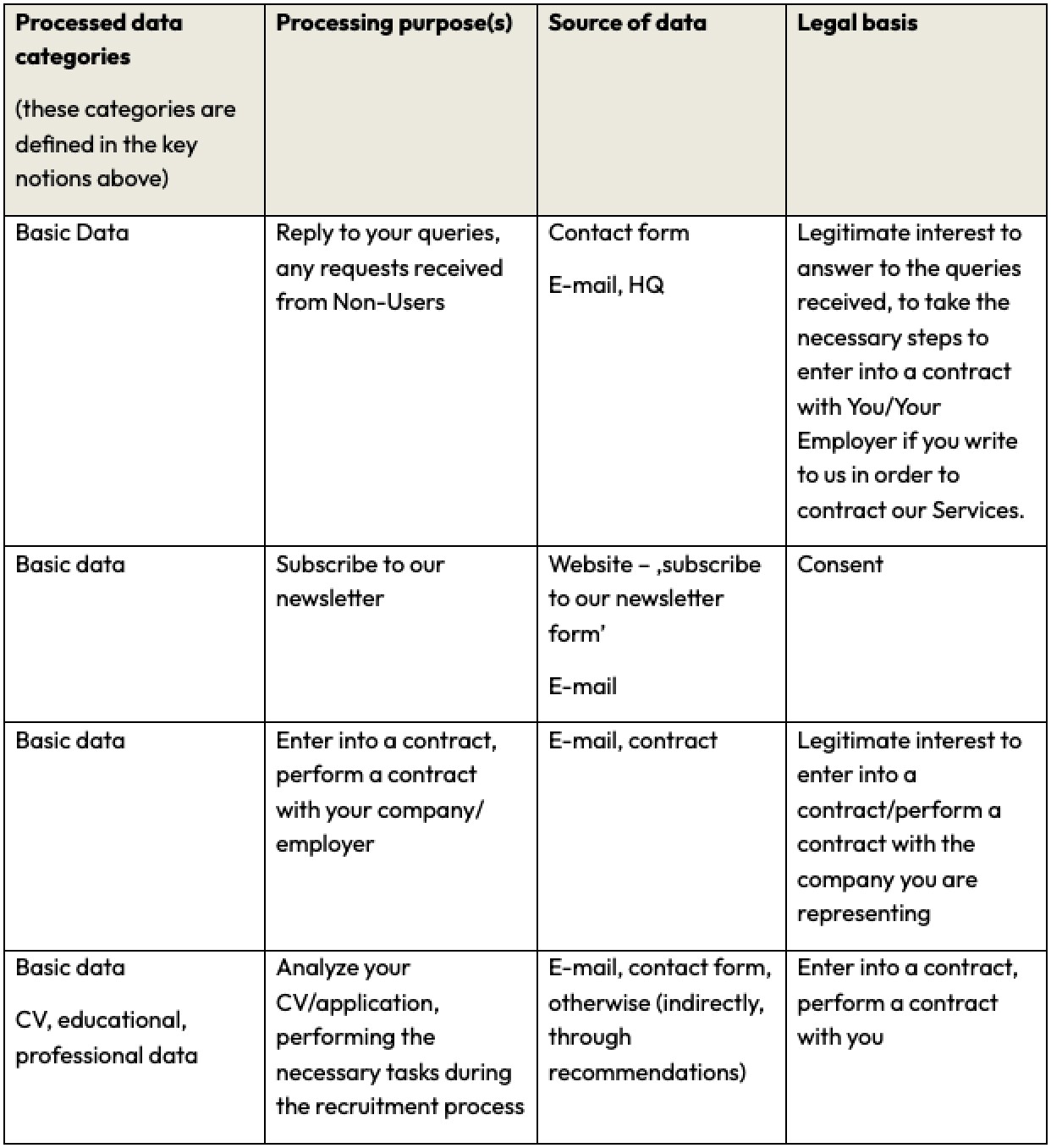 3.4. If you contact us via our website or by e-mail or you have a relationship with Butterfly (e.g., if you are interested about our services, about a job in Butterfly or a partner or prospective partner) we will process Your Personal Data as Controller as follows