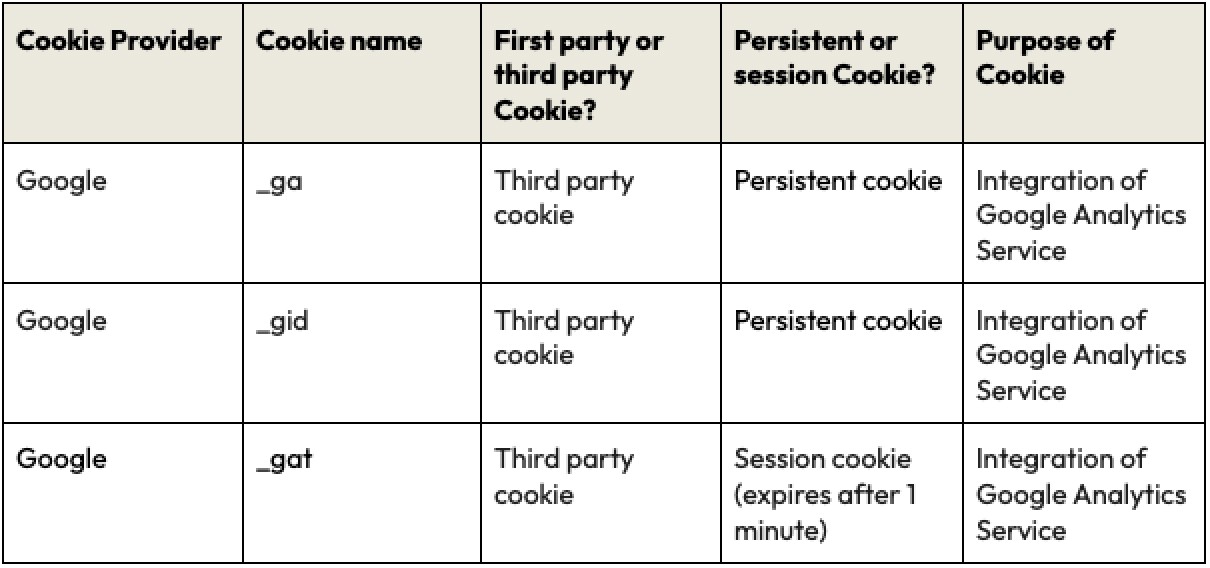 The following table and information set out the Cookies which are used for the Service. It also provides details of third parties that set cookies: